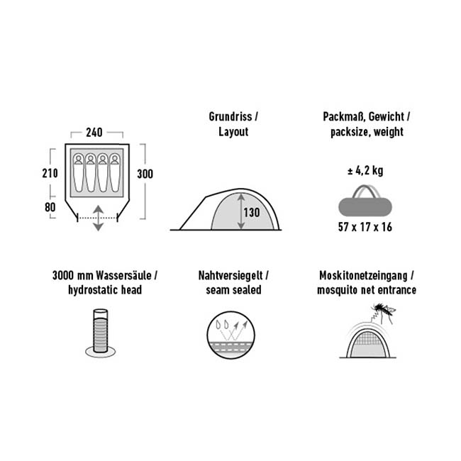 Fly Sheet: Weather protected entrance, vestibule and storage, crystal clear window, functional entry with the side opening to avoid entry height level, 2 permanent ventilatons with distance holder, color marked poles