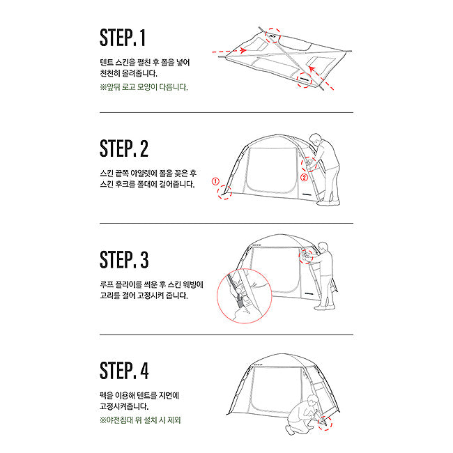 - Component :Skin, Loof, Main poleX2ea, Canopy poleX2ea, Steel pegX12ea, StringX8ea, Multi shelf, Storage bag