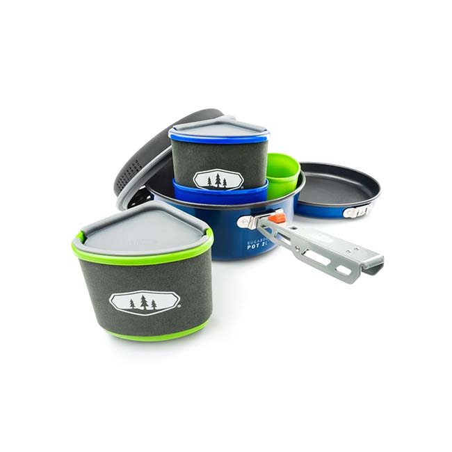 Contents: 2L pot, 8" frypan, Strainer Lid, two 14 fl. oz. mugs with insulated sleeves, two 14 fl. oz. bowls, two Sip-Through Lids, folding pot gripper, dual-purpose carry sack/sink