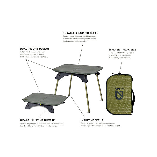 - Dual-height design offers both low picnic blanket setup or elevated side table options. (Just deploy the hidden table legs!)