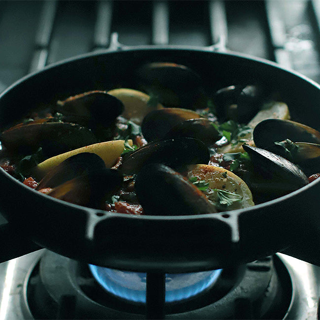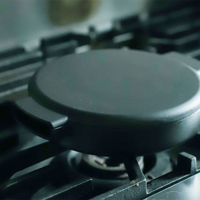 - A cast iron pan with rust-proof enamel coating